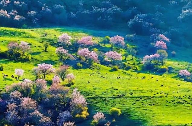 新疆伊犁新源县的吐尔根杏花沟,是宇宙上荒原的大边界原始野杏林,绵延数万亩,成为春季伊犁最迷东说念主的景致之一。