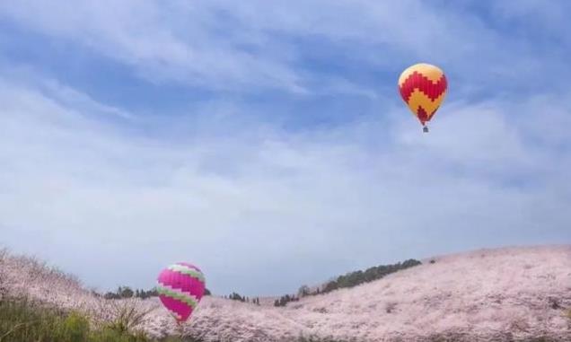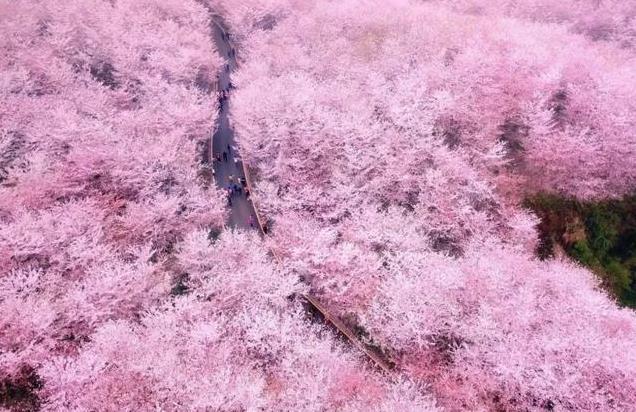 贵州贵安的平坝樱花坛宛如极乐宇宙,每到春天,千千万万株樱花竞相绽放,粉色花海彭胀至天空,绮丽相配。