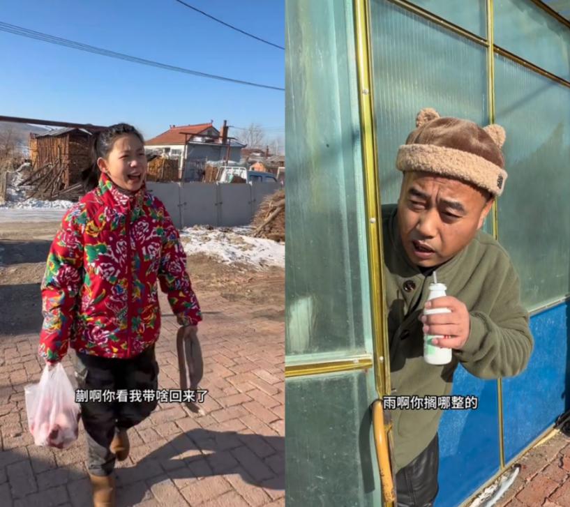 配景音乐,是一贯的《大东北我的家乡》;冲入每一位不雅众眼中的画面,是一位高明马尾花袄女,正手提原材料跟家里东谈主打呼叫。而回复他的东谈主,偏巧是一个看上去带点无能的小个子男性。