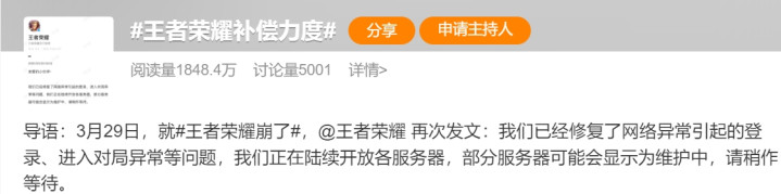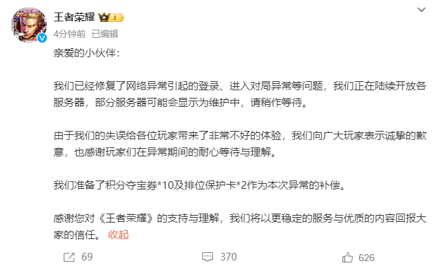 29日凌晨,王者荣耀官方再发声明,称已确立问题,并公布抵偿决策:咱们依然确立了齐集格外引起的登录、参加对局格外等问题,咱们正在链接怒放各工作器,部分工作器可能会露馅为珍藏中,请稍作恭候。