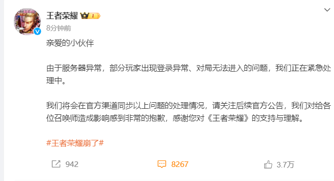 随后,王者荣耀伏击回话:由于工作器格外,部分玩家出现登录格外、对局无法参加的问题,咱们正在伏击不断中。