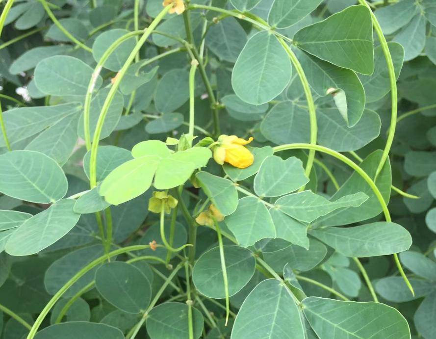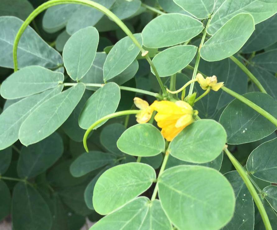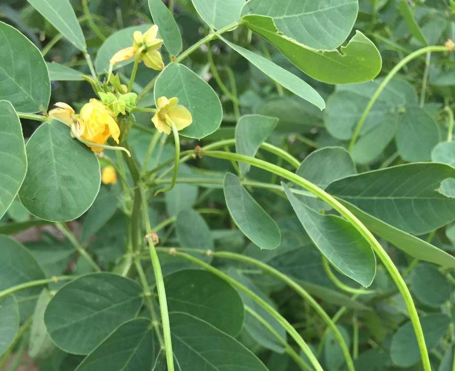 决明子天然说是亚灌木植物,然而事实上它的植株并不高,一般不跳跃1米,和确凿花生差未几。决明子的茎耸立,上部有好多分枝,它的叶子互生,双数羽状复叶,很像花生叶。决明子的花期在6-8月,前段时刻笔者在荒原拍摄视频的时候,就遭受一派决明子正在吐花。决明子的花也很像花生,花是黄色的,有5泡花瓣。