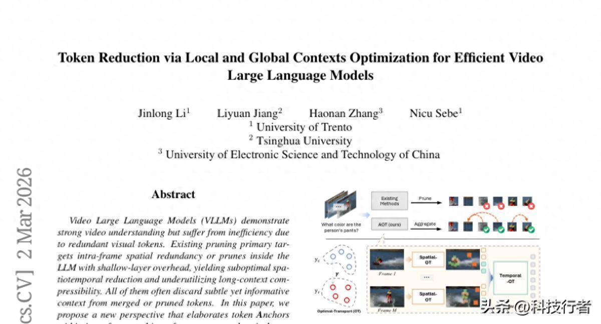 近期,特伦托大学团结清华大学和电子科技大学的相干团队发表了一项引东说念主凝视的相干后果,论文题为《Token Reduction via Local and Global Contexts Optimization for Efficient Video Large Language Models》,发表于2026年3月的arXiv预印本平台,论文编号为arXiv:2603.01400v1。这项相干非凡治理了视频AI模子运行时耗电过多、速渡过慢的问题,通过一种名为AOT(Anchor with Optimal Transport)的新技巧,见效让视频AI在保合手险些相通准确度的情况下,将狡计量削减到原来的十分之一。