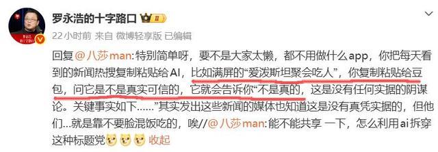 因为当今的AI不错快速搜索全网府上,思要把事情的真相复原极度容易,老罗还专门举了一个例子,比如关于“爱泼斯坦约聚吃东谈主”的坏话,只好负贬低一下AI,它就能告诉你这是简直假的,致使还有详备分析历程,仅仅因为群众懒得问。