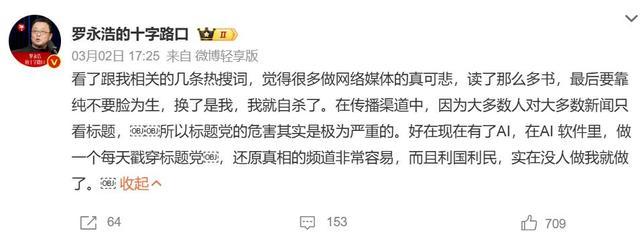 老罗看了多条被曲解的热搜词条,算是绝对忍不住,凯旋炮轰这类收罗媒体:“真可悲,读了那么多书,临了要靠不要脸为生。”