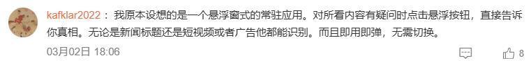 挑剔区里也有东谈主发表我方的倡导,他说不错策画一个像悬浮球雷同常驻的利用,当你对看到的本体有疑问时凯旋点击这个悬浮按钮,AI就能帮你分析。