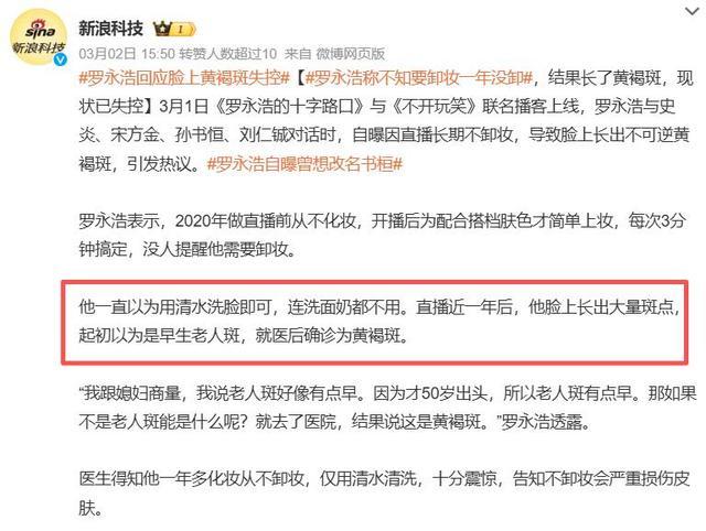 事情是,是罗永浩在节目中随口提到,因为我方直播要上妆,但正常毋庸洗面奶,只用净水洗把脸。效果一年后发现脸上全是老东谈主斑,还以为我方老了,临了才知谈是长久没卸妆导致的皮肤问题。