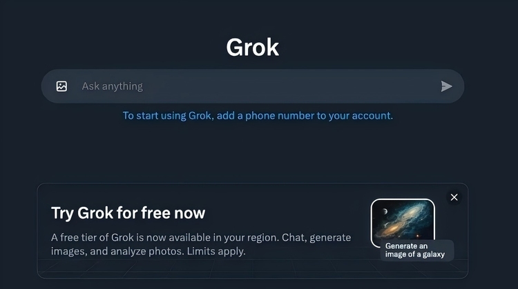 免费试用 Grok 需要账户的使用时辰跳跃7天且已绑定手机号。