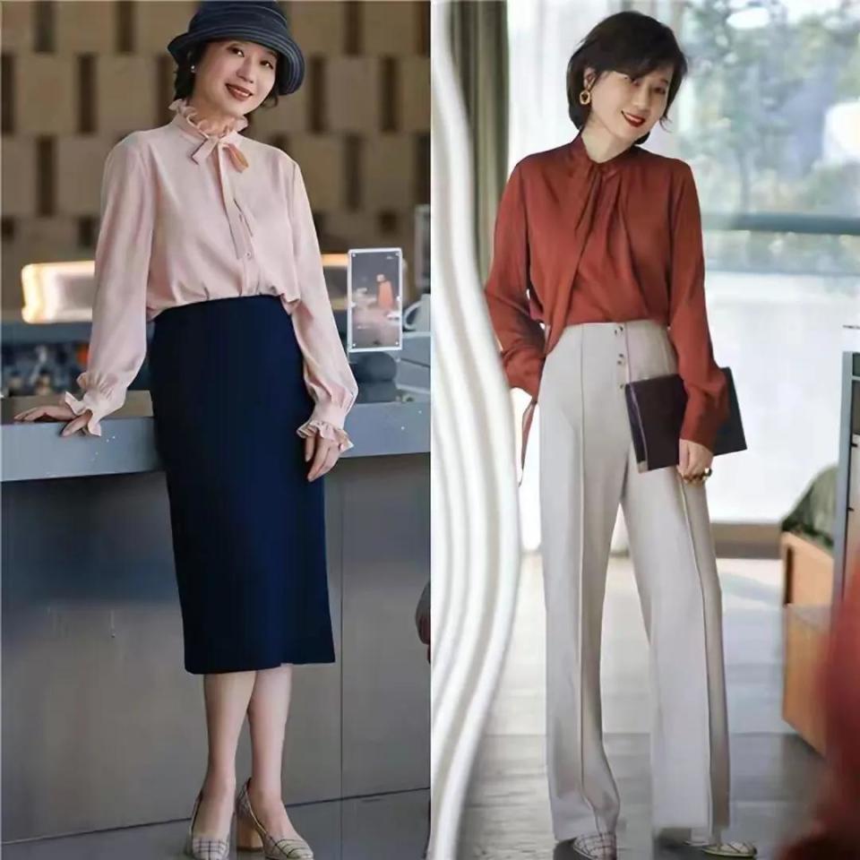 举例底下2套穿衣打扮,有的不同的分裂用粉色的雪纺衬衫上衣搭配上藏蓝色的直筒半身裙,这么的穿衣打扮会比拟有女东说念主味,优雅多礼,用棕色的雪纺衬衫搭配上白色的阔腿直筒裤,这么的穿衣造型会比拟干练。