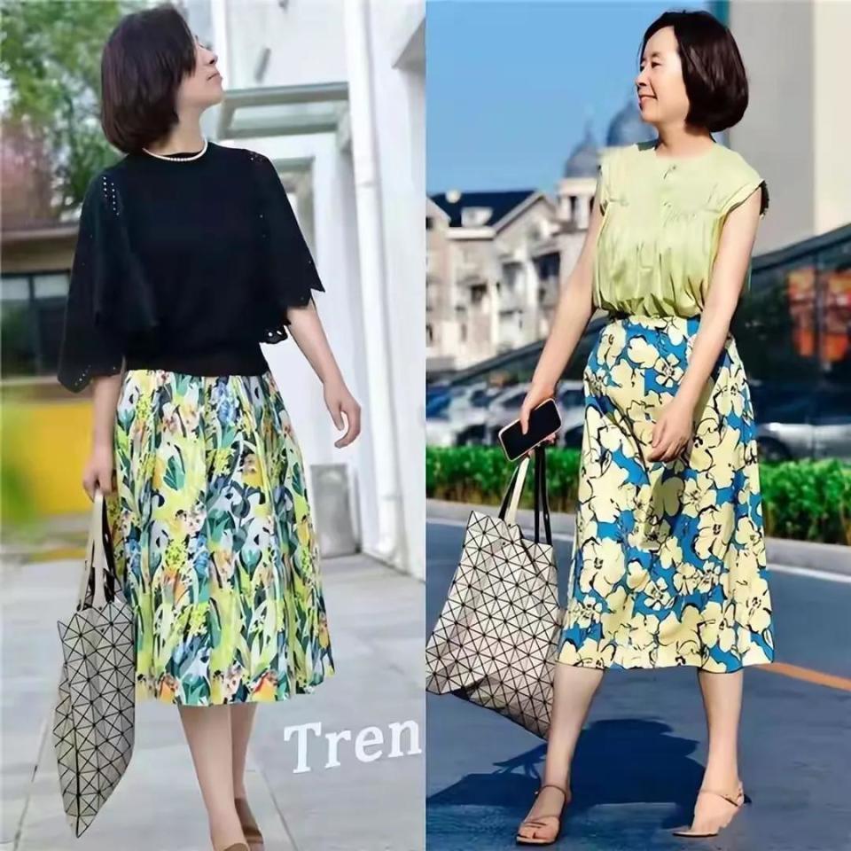 中年女性思要我方的穿衣打扮比拟和睦优雅的情况下,用半身裙来穿搭如实很可以,况且像底下这种印花的伞状半身裙搭配上纯色系的衬衫上衣,看起来会比拟致密,同期能达到一个遮肉显瘦的成果。